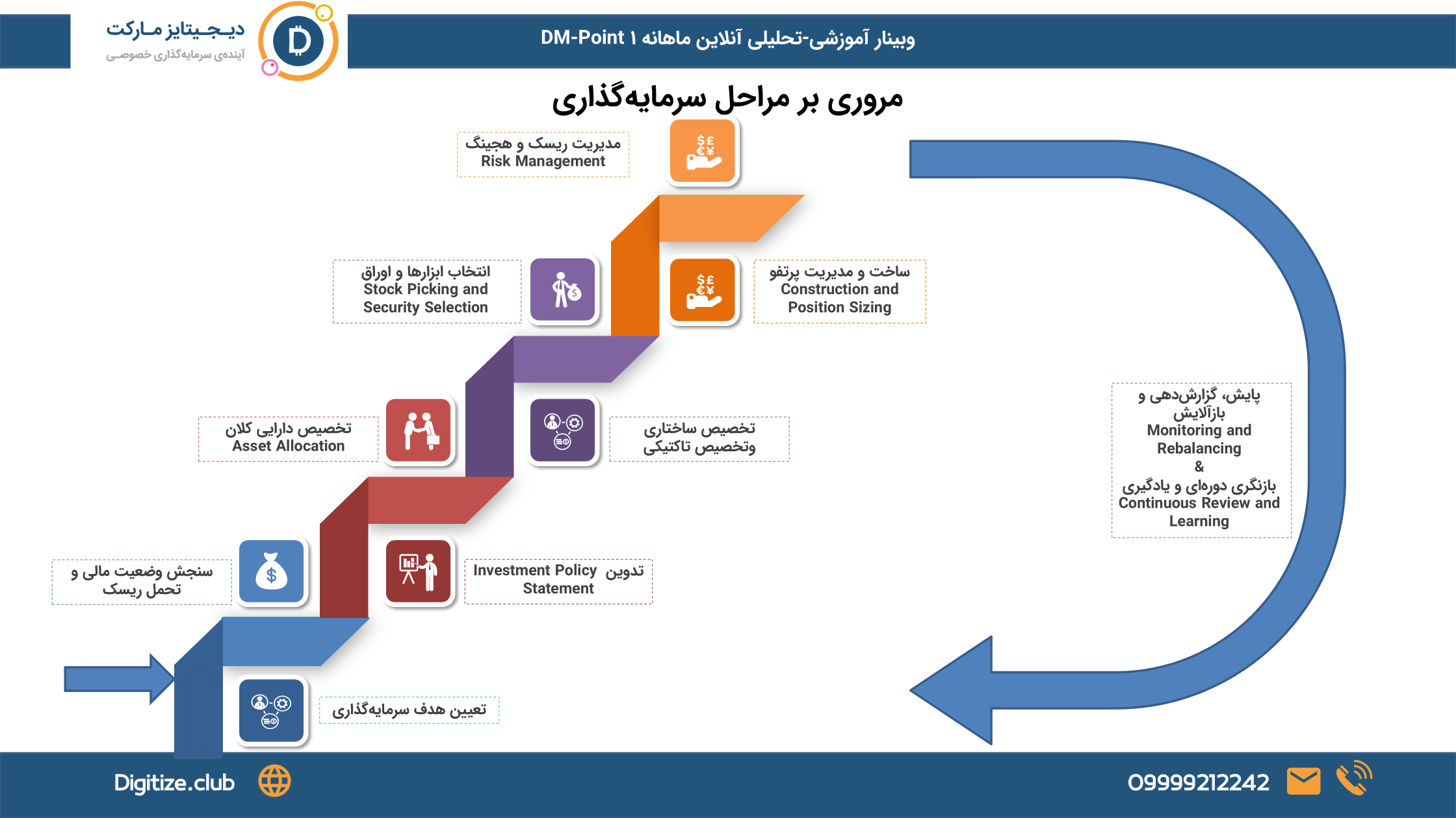 دکتر احمدآبادی سپس چرخه سرمایهگذاری را تشریح کرد: از تعیین هدف و سنجش وضعیت مالی و تحمل ریسک، تا تدوین سیاست سرمایهگذاری (Investment Policy Statement) و تخصیص داراییهای کلان.