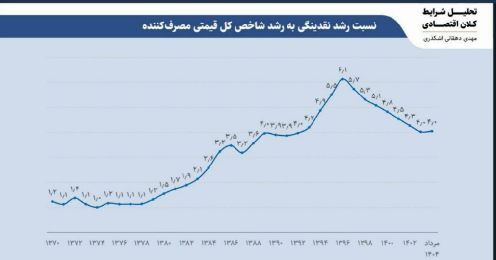 در ادامه وبینار، آقای دهقانی وارد تحلیل ریشههای تورم شد و توضیح داد که برای فهم درست شرایط فعلی، باید به نسبت رشد نقدینگی و رشد شاخص قیمت مصرفکننده نگاه کرد. او با اشاره به دادههای تاریخی گفت در دهه ۷۰ و حتی اوایل دهه ۸۰، این نسبت تا حد زیادی ثابت بود و همین ثبات، بازتاب یک دوره نسبی از تعادل اقتصادی بود. اما از زمانی که سیاستهای کلان دولت تغییر کرد، این نسبت بههم خورد و تورمهای پیدرپی و سنگین شکل گرفت. بهگفته او، هر زمان این نسبت افزایش پیدا میکند، اقتصاد در آستانه یک موج تورمی تازه قرار میگیرد و هر زمان کاهش مییابد، به این معنا نیست که سیاست پولی موفق شده، بلکه صرفاً اقتصاد در حال تسویه بدهی تورمهای گذشته با خود است.