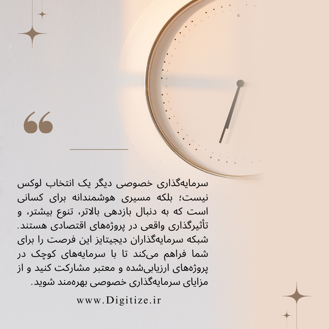 با درنظرگرفتن این مزایا، سرمایهگذاری خصوصی میتواند یک گزینه ایدهآل برای افرادی باشد که به دنبال فرصتهای جدید، رشد مالی بلندمدت و تأثیرگذاری مثبت بر اقتصاد هستند. عضویت در شبکه سرمایهگذاران دیجیتایز، دروازهای است بهسوی این دنیای نوین سرمایهگذاری!